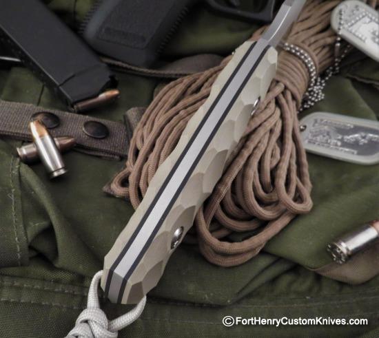 Custom Thumb Recess and Extra Thumb Ridges on the Spine are in just right location to enhance the Grip of this Tough Blade. Thick Black G-10 Liners help stabilize the handle scales.