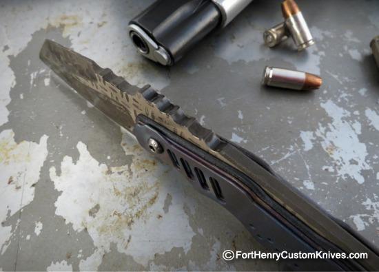 The Custom Handle design creates a Secure Full sized Grip, the Skeletonized construction and the Titanium Overlays help to keep the knife light and well balanced. Note the Second Titanium Layer has a Subtle Blue Anodized coloring.