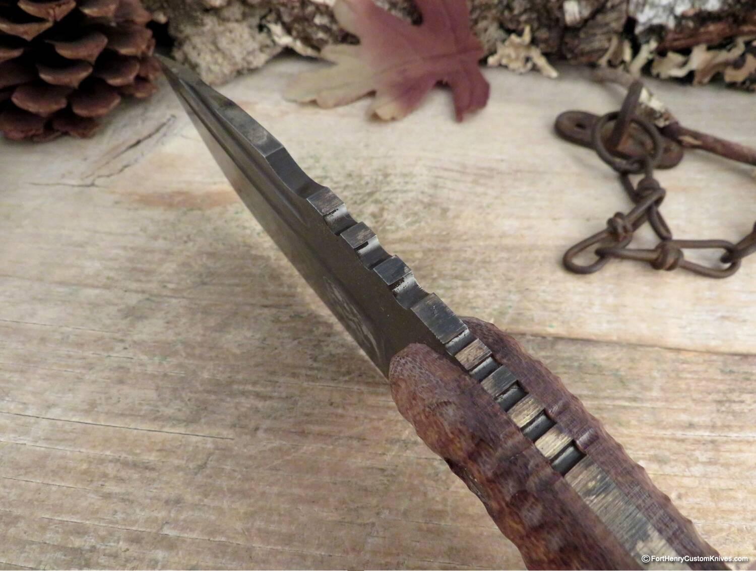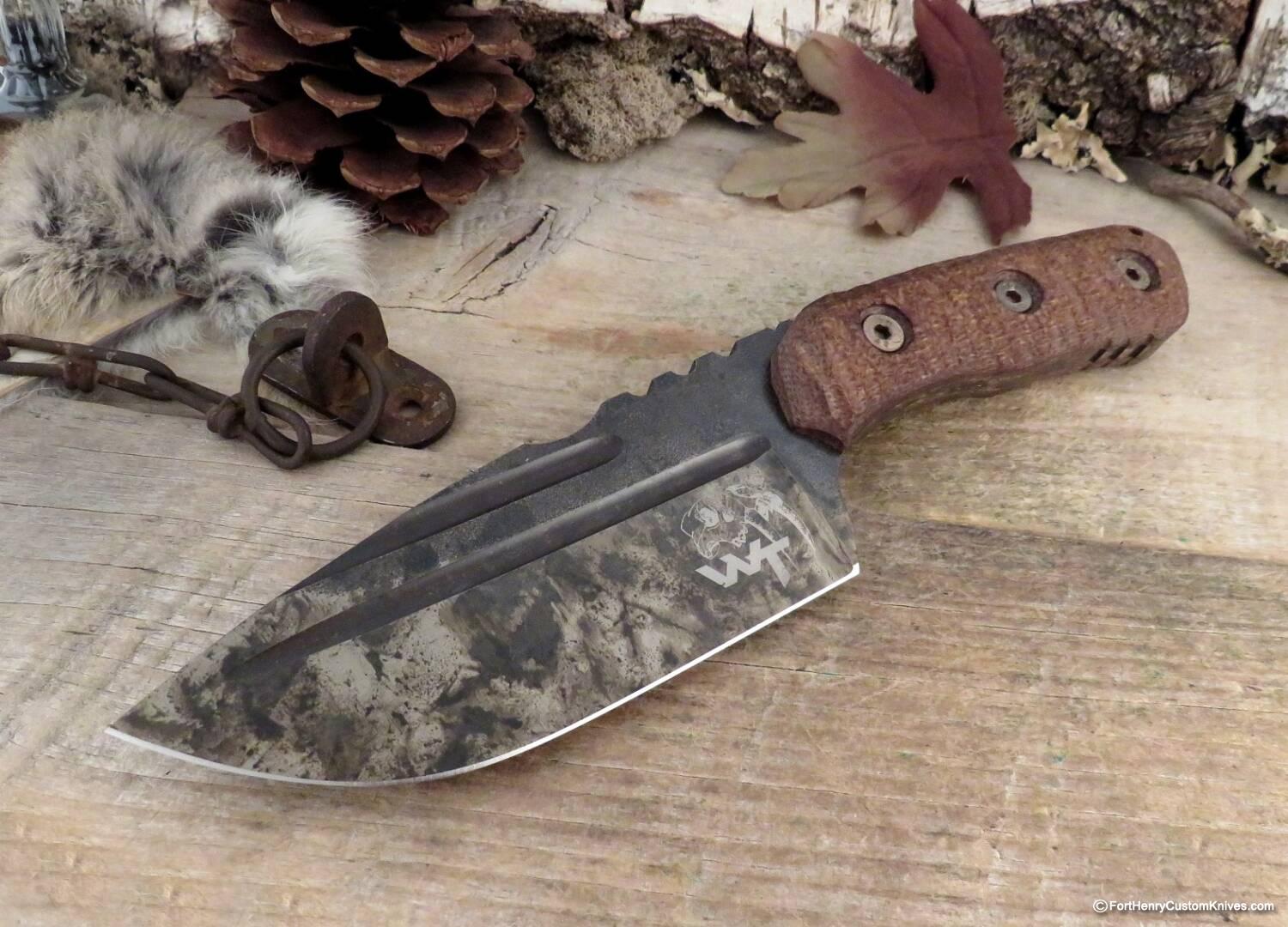 The example also has Aggressive Thumb Grooves on the Spine. This Wander Tactical Mountain Lion has an ergonomic Micarta Handle with Traction grooves carved into the entire surface of the handle.