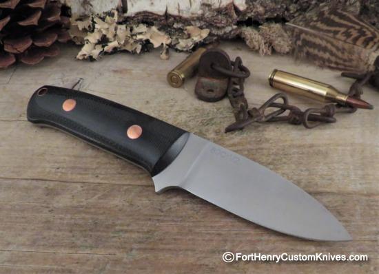 Here is a Gorgeous Custom Drop Point Hunter Variant with Black Canvas Micarta handle scales and Copper accents.