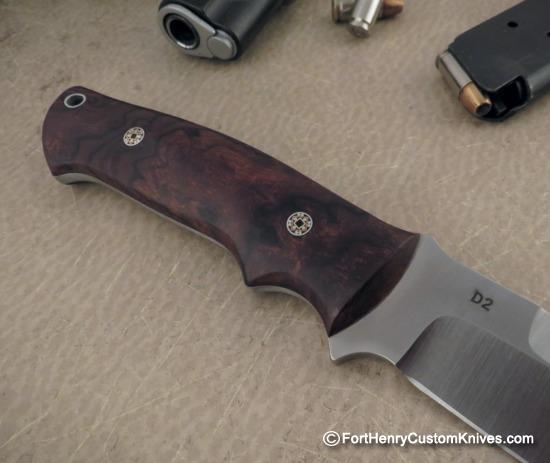 This Crotts Custom Tactical is very clean from front to bank. Extremely comfortable / Ergonomic handle with a Birds Beak Butt for Extra Security ~ this one also sports some Awesome Ironwood Burl handle scales with Rare Mosaic Pins.