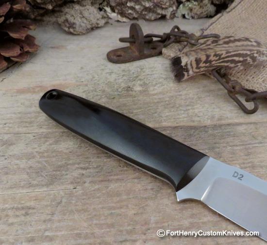 This one has Dan’s N-Vizable Polished Black micarta handle ~ he has incorporated Black Micarta blind bolt covers to make the handle appear screwless.