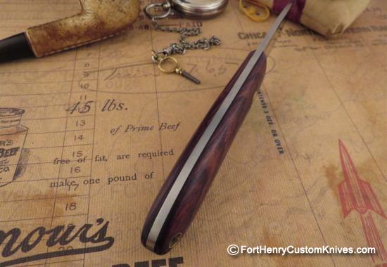 This Crotts Personal Carry has some wonderful characteristics, Dan designed this model to have a near perfect ratio of blade to handle length. For the handle, Dan chose some beautiful Stabilized Camatillo Wood.