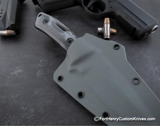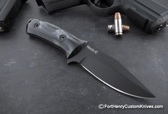 This special steel has some of the same component compositions as the PM materials ~ this provides High Hardness ability with extreme Wear and Chipping Resistance. This example also has the added characteristic of aTough, Stealth Cerakote FinishDan also went to the Trouble of having his Logo Laser Etched and to add Removeable Torx Head Bolts Cerakoted
