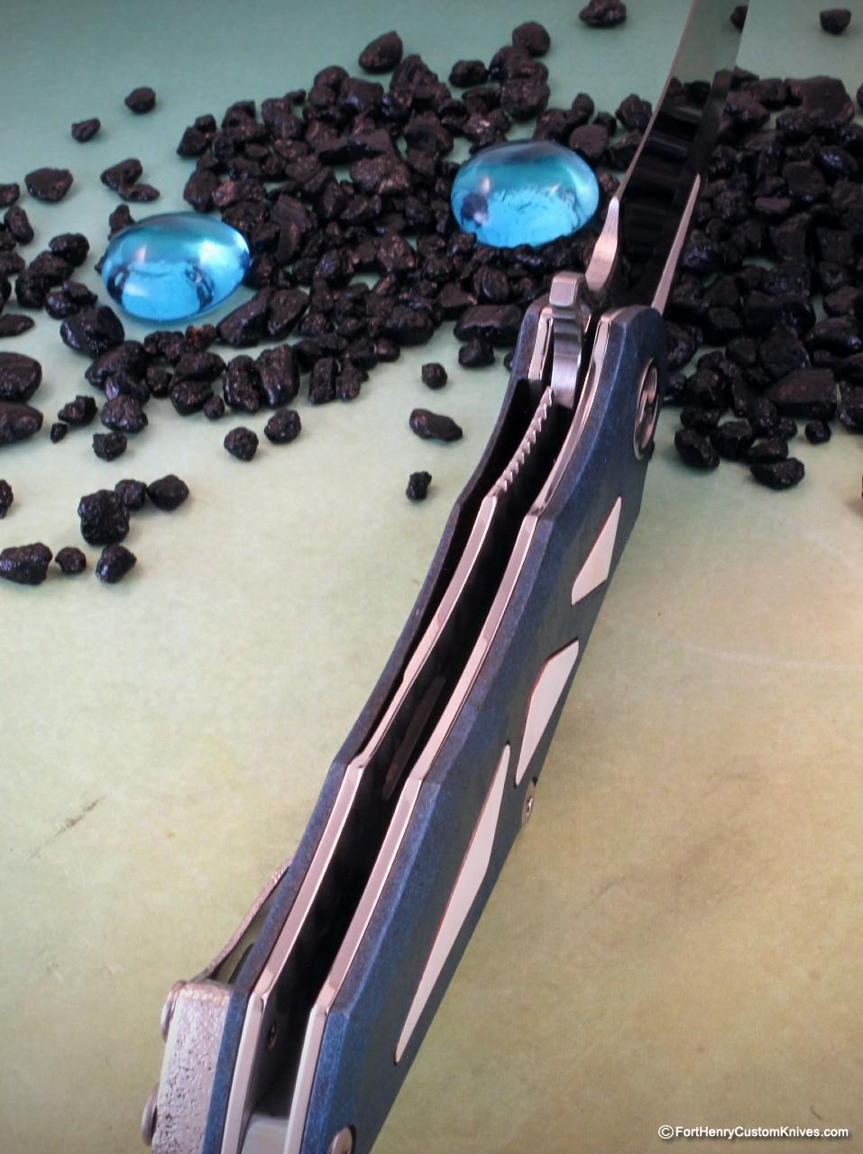 This entire knife has almost too many Special Features to showcase adequately. ~ this knife features Dew’s Gorgeous Copper / Blue Irosabi finish on the elegantly Contoured Titanium Frame. *Irosabi – a mixture of rust generated by oxidation and Japanese urushi colored lacquer.