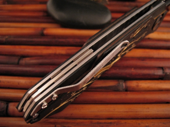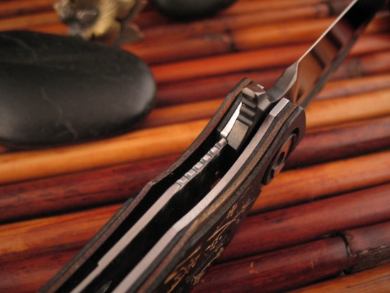 The ergonomics of this knife are wonderful, with a Stainless Steel frame that has excellent Texturing and a Floating Copper / Stainless Backspacer