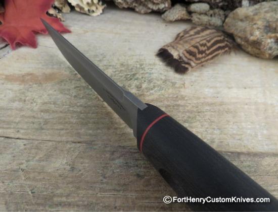The Hand Ground blade was crafted from High End Crucible Particle Metallurgy CPM 3V steel and given a Cryogenic Quench. This steel has properties that make it unique among modern steels; it excels at Toughness and is widely known as a Superior Performer. It has a good amount of Carbon and a Higher Chromium and Vanadium content which puts it at the top of the Stainless Category.