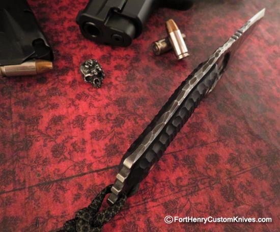 The handle scales have a Custom Texture and Traction Ridges that will provide a sure grip even under other than ideal conditions. Due to the Extended Butt this knife is Secure and Comfortable in both the Forward and Reverse Positions.