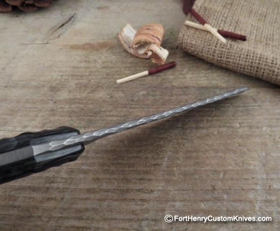 The Blade on this Cobble Blade Pitbull has a Dark Sand Blasted Finish and the Spine has a Unique Hand Applied Flint Napped texture. Professional Heat Treat provides a an Incredible 62 on the Rockwell chart.