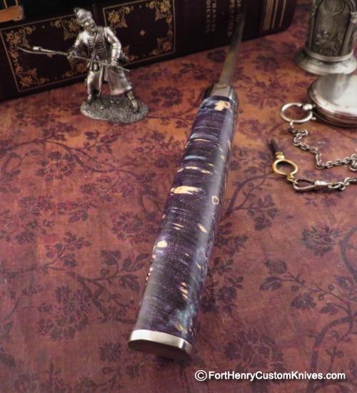 Here is a knife that embodies the true spirit of a Hand Made knife. Georgi Crafted the Handle using Gorgeous Dyed Stabilized Maple Burl that reminds me of a Van Gogh’s “Starry Night” painting. The Custom Stainless Steel Finger Guard is Mirror Polished with a Subtle Brass Spacer.