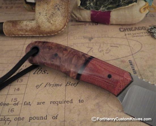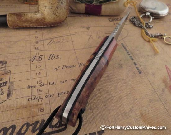 Joshua chose some Beautiful Stabilized Maple Burl for the handle Handle Scales and then he added Custom Natural Micarta Bolsters and Black Spacers.