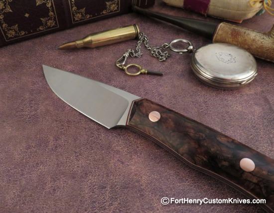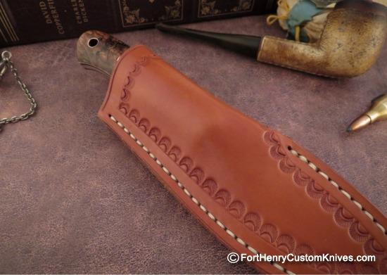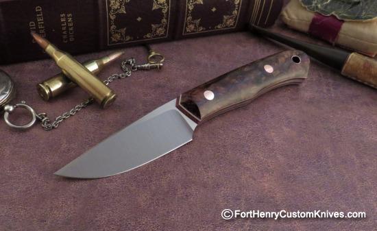 This knife was Hand Crafted with a very Comfortable, Full Grip Handle. The Gorgeous Handle Scales are Presentation Grade Spalted Maple with Copper Blind Bolts and a Lined Lanyard hole.