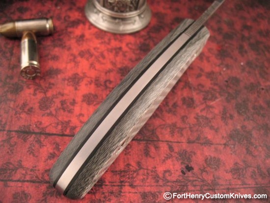 The Handle scales are Custom Contoured, Thick Silver Twill Carbon Fiber that have Black Liners. The material is so seamless that you barely even feel the joint of the materials.