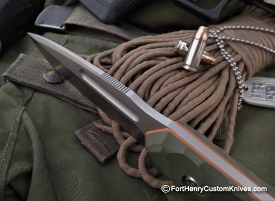 Custom Thumb Recess and Extra Thumb Ridges on the Spine are in just right location to enhance the Grip of this Tough Blade. Thick Orange G-10 Liners help stabilize the handle scales.