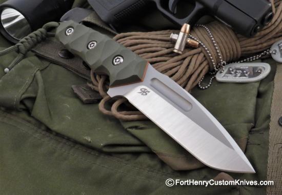 This PG Knives Cayman has Very Comfortable, Custom Contoured, Full Grip G10 Handle Scales held on with Torx Screws. The Handle has a Full Hand Filling Shape with room to move back for Chopping or Forward for close up work, best for a Medium to Large Grip.