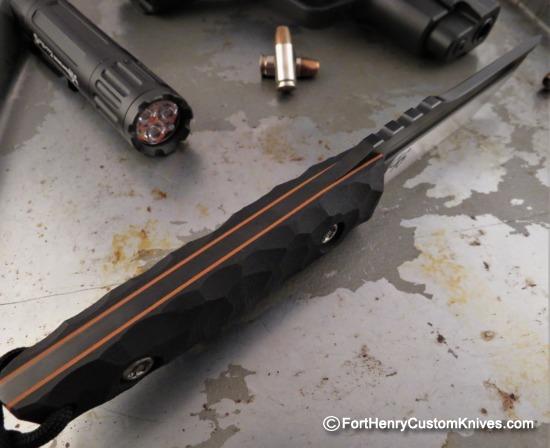 This is Piotr’s Compact Tanto model – a knife that has its roots in Asia but under Piotr’s hand, the design has evolved into a Futuristic Fighting knife.  The Hand Ground Modified Tanto Blade is a Respectable .170 Thick, it has a Two Tone Finish with a Belt Sanded / Satin Bevel, a Near Full Height Flat Grind and Hot Oxide Flats.