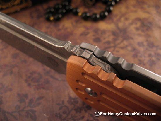 This Knife has Custom Milled Fullers on each side as well as deep Traction Ridges on the Top and bottom. The Damasteel blade Fires Like a Rocket! Perfect Detent with no wrist action necessary. The Gorgeous Damasteel blade has a Beautiful High Polished finish with superb Etch to show the intricate Pattern of the Stainless Damascus.