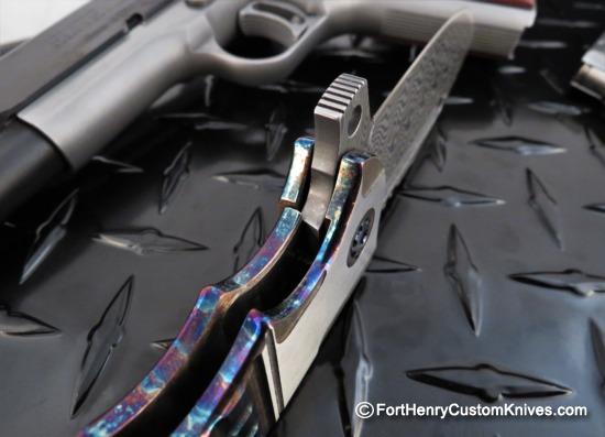 The Thick Titanium Pocket Clip has a Unique Titanium Roller Tip and Matching Custom Acid Rain Anodizing. This big knife will ride Extremely Low and Out of Sight in the Pocket.