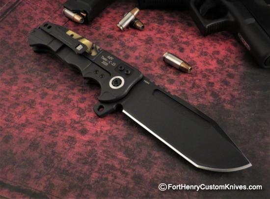 Robust with Unique Materials, this tough Framelock has Wonderful Hand Filling Ergonomics. Lightning Fast Flipping action due to the Internal Bearings and excellent Balance of the Blade. All components of this knife have a Cerakote Stealth finish.