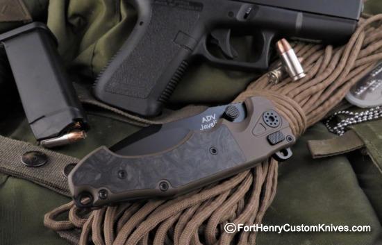 A unique Customized Configuration that is Robust with a Double Ground Spearpoint Blade that has Lightning Fast Flipping action due to Internal Bearings and excellent Balance. with Unique Materials, this tough Framelock has Wonderful Hand Filling Ergonomics. Either Desert Tan or Black ~ all components of this knife have a Custom Cerakote finish.