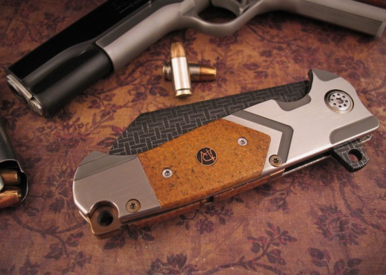 Custom Anodized Pivot Collars and Thunderstorm Kevlar inlays are just two of the Custom Accents of this piece. The M390 Wharncliff Shaped Blade was first Cerakoted and then etched with a unique Basketweave pattern.