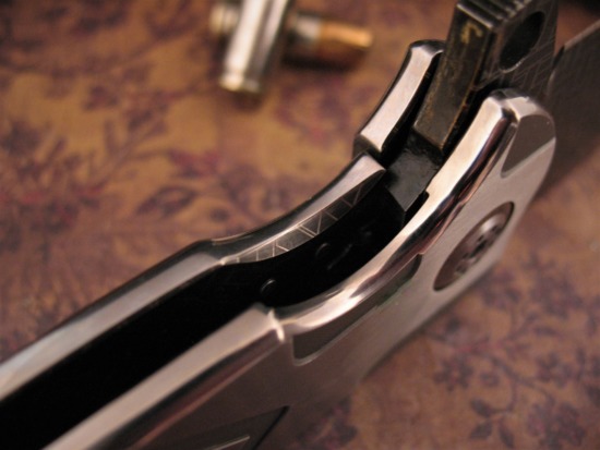 The Custom Thumb ridges on the Blade provide an extremely secure grip. Note the extrremely Tight Fit of the Rang opf the Blade over the Thich Stop Pin.
