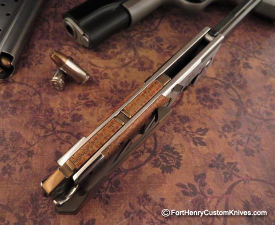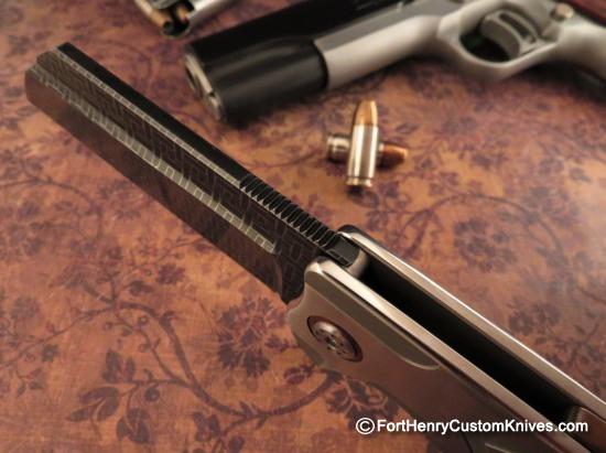 Custom Anodized Pivot Collars match well with the Thunderstorm Kevlar inlays. The M390 Wharncliff Shaped Blade has a Complicated Duplex Grind and was first Cerakoted and then etched with a unique Basketweave pattern.