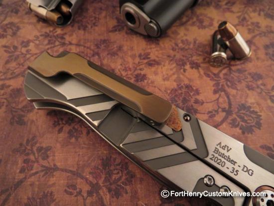 The Thick Titanium Pocket Clip has a Two Tone finish. This big knife will ride Extremely Low and Out of Sight in the Pocket.