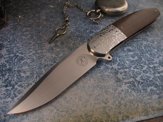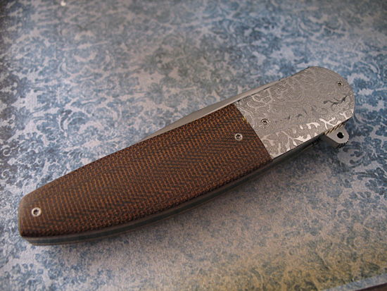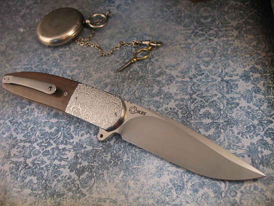 The handle scales are great looking Brown Linen Micarta – but what really catches the eye are the Beautifully Hand Textured Stainless Steel Bolsters (these are created by Andre’s Wife).