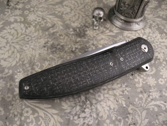 The blade was hand ground from tough N690 Stainless steel which Andre gave a near Flawless Satin finish and the handles are Lightening Strike Carbon Fiber with a small Carbon Fiber Spacer.