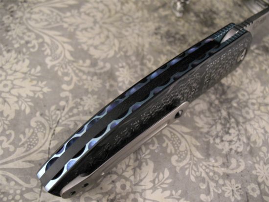Andre gave this knife a Fully Fileworked and Anodized Titanium Frame with a G10 backspacer.