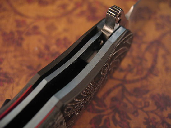 The Integral Thumb Recess along with the subtle Thumb Ridges (which are continued onto the Anodized Ti Frame) make for a very comfortable Full Hand Grip.