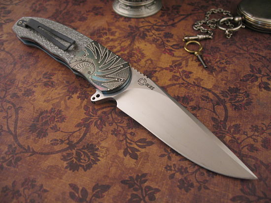 The handle scales are Silver Twill Carbon Fiber and are Precision Fit to the Hand Stippled Zirconium Bolsters.