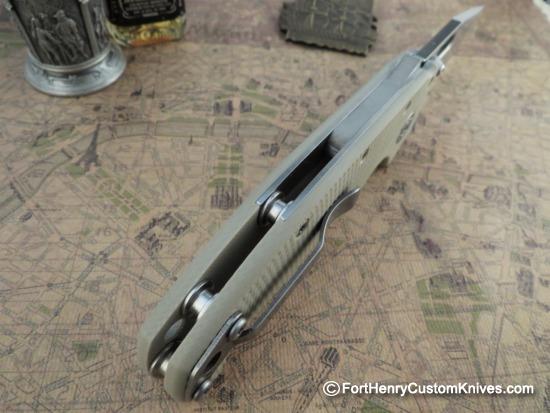 This powerful Lockback folder design is precision crafted with a thick Titanium Lock and a Thick Cross Hatched G-10 Front Scale. The CPM 20CV Blade has a very crisp Mid Height Hollow Grind with a uniform Stonewashed Finish.