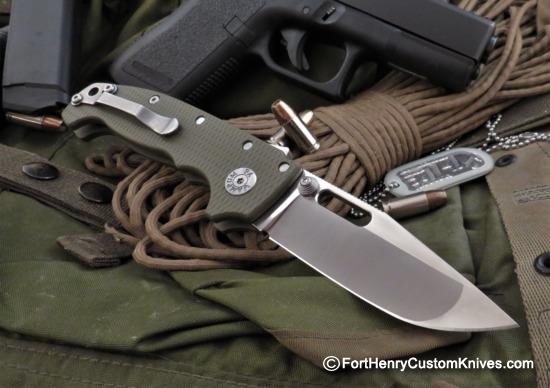This powerful Lockback Folder is precision crafted with a thick Titanium Lock and Thick Cross Hatched G-10 Scales. The blade opens very smoothly using the Ambidextrous Thumbstud.