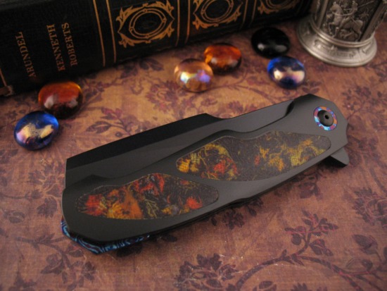 This is Anton van der Westhuizen’s Gorgeous Boudicca Flipper. It features a Stealthy Smooth Black Cerakote Finish on all Surfaces and twin pockets of “Night Fire” Rag Micarta.
