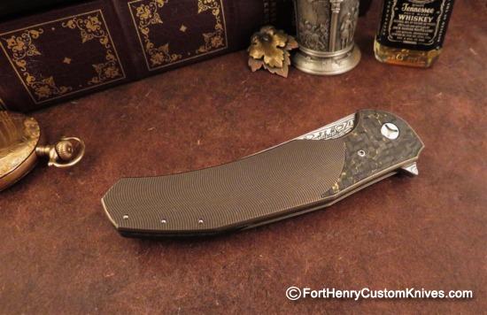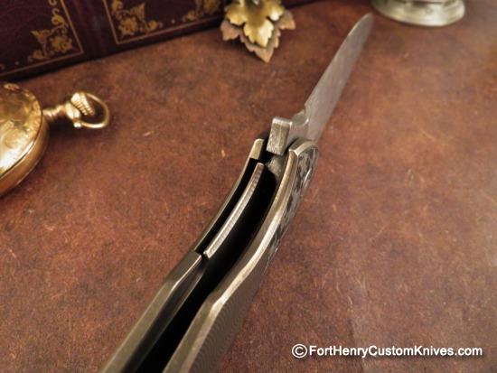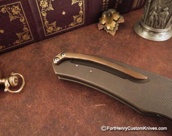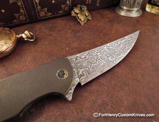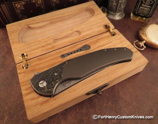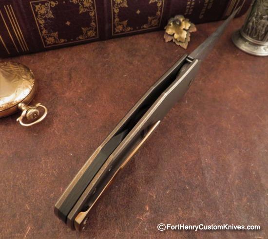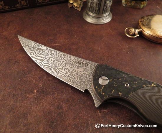 The smoothness of the Flipping action is sure to put a smile on your face! The knife has a deep Detent, along with the Internal Bearing system and excellent Balance of the blade – this knife Flips Effortlessly. The Hand Ground Swedish Stainless Damascus / Damasteel blade has a Full Height Flat Grind that will cut like a Laser. The Custom Gold Strike Carbon Fiber Bolster is precision inlayed into the Frame and has a perfect continuation of the Sound Wave Texture.