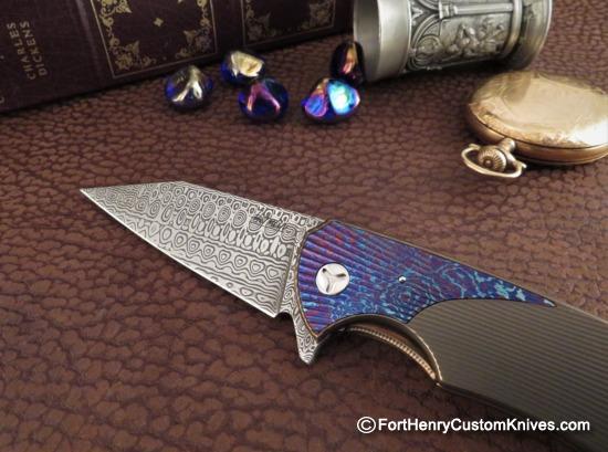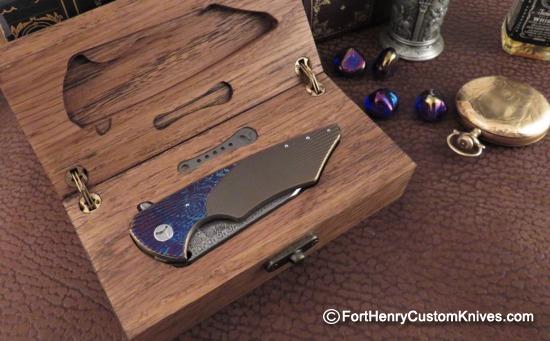 The Hand Ground Damsteel blade has a Full Height Flat Grind that will cut like a Laser. The Custom Timascus Bolster is precision inlayed into the Frame and has a perfect continuation of the Sound Wave Texture.