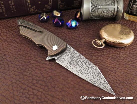 The sleek profile when open reminds one of a streamlined Rocket. The Contoured Titanium Frame has been given a unique “Sound Wave” surface Texture as well as Rich Gold Anodizing.