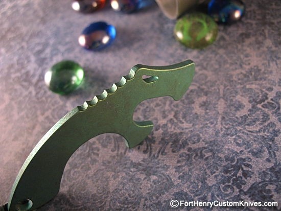 This Snake Bite was given a Custom Tumbled & Two Tone Anodized surface treatment, truly stunning in color and sure to gain comments. Note the Profile of the Snake Head like design.
