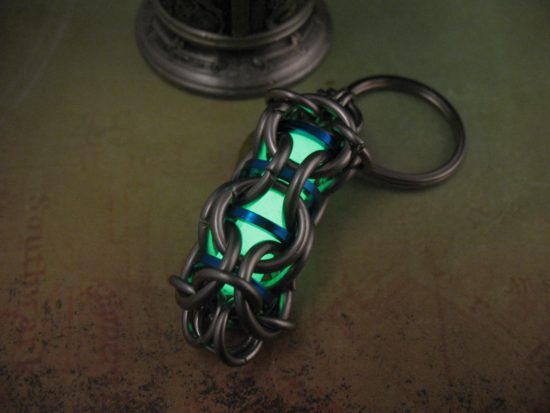 The Key Chain is made with Stainless Steel  and Anodized Ti Rings – all around a thick Glow in the Dark cylinder.