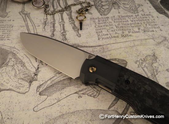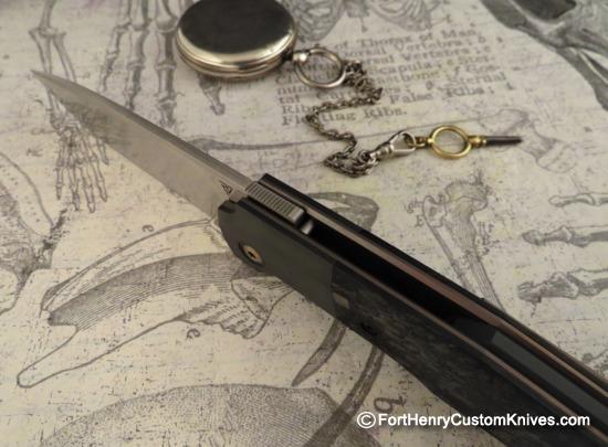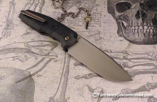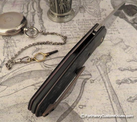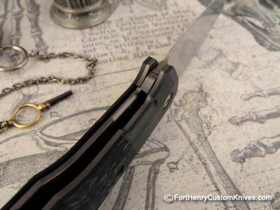 The handles are wonderfully contoured Marble Carbon Fiber ~ this Handle is a Full / Hand Filling shape with excellent ergonomics. Thick Bronze Anodized Titanium Frame and this model also has a Thick, Zirconium backspacer.