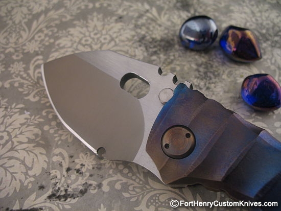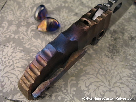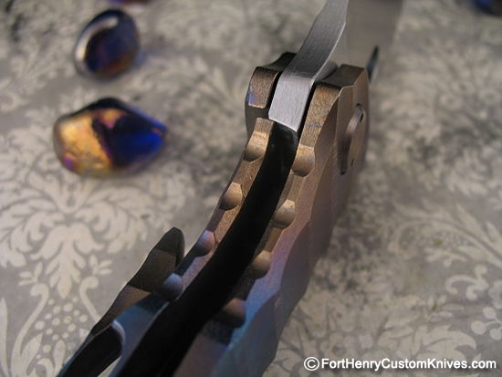 The Spine of the thick CPM 3V blade has Deep Custom Thumb Ridges which continue onto the Ti Frame.