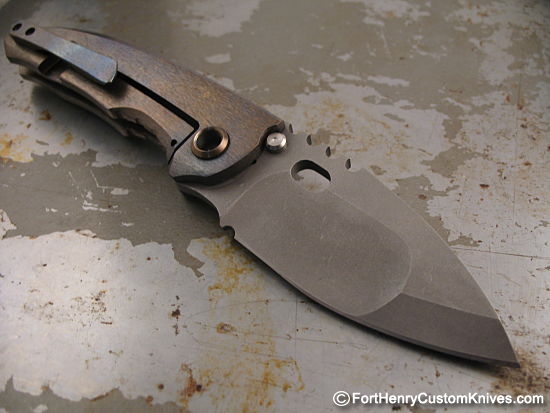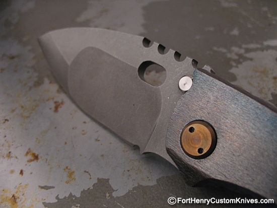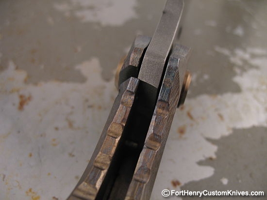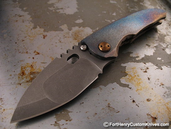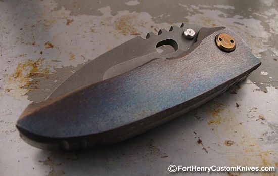 I LOVE the Custom Finish that Dalibor has given this Beastly Folder. The entire One Piece Frame has subtle coloring. The Spine of the thick Titanium Frame is one of the thickest I have seen and has deeply Anodized Blues and Copper colors.