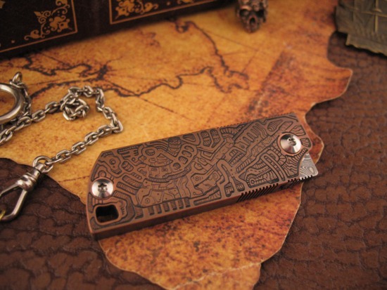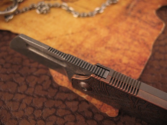 The Copper front scale and Titanium Reverse Scale match perfectly, the Double Row of Thumb Ridges on both the Frame and the Spine of the blade help to enhance the grip.