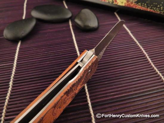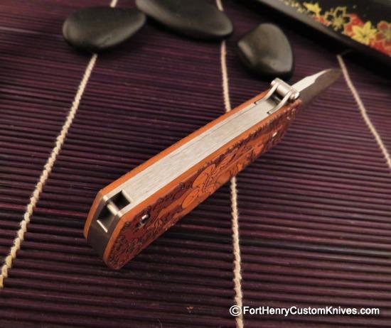 This entire package has a Ton of Customized Enhancements. With a Firm Pull on the Charging Handle, the Blade Leaps out of the frame very fast! Both the Frame and the Razor Sharp M390 blade have Custom Deep Relief Etching on the entire surface with plenty of cutting edge for most any EDC Chore.