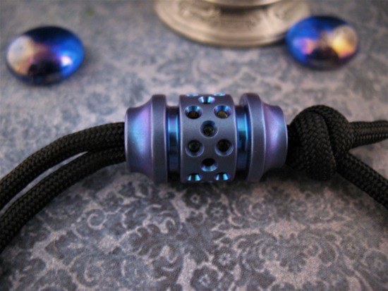 This one has Gorgeous Irredescent Anodizing with a Polished Outer Surface. The OAL of the entire piece is 1″ with a hefty Diameter of .6 ~ but the entire bead weighs a little less than 1/2 Ounce!