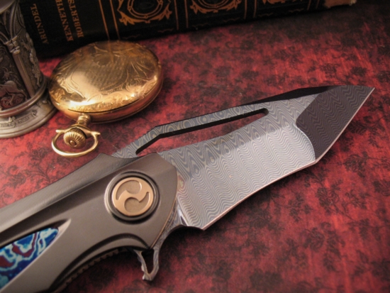 An extreme Deep Set Timascus Pocket clip allows this knife to ride out of sight!