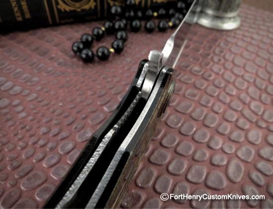 The Operation of this knife is extremely smooth, the Flipping action is impeccable due to the Caged Bearings and Excellent Balance of the Blade.  Look closely and you will see that Dew Hand Ground the 14C28N Blade with a complex Duplex Grind and Kiridashi Tip. He worked to attain a Flawless Mirror Polish.