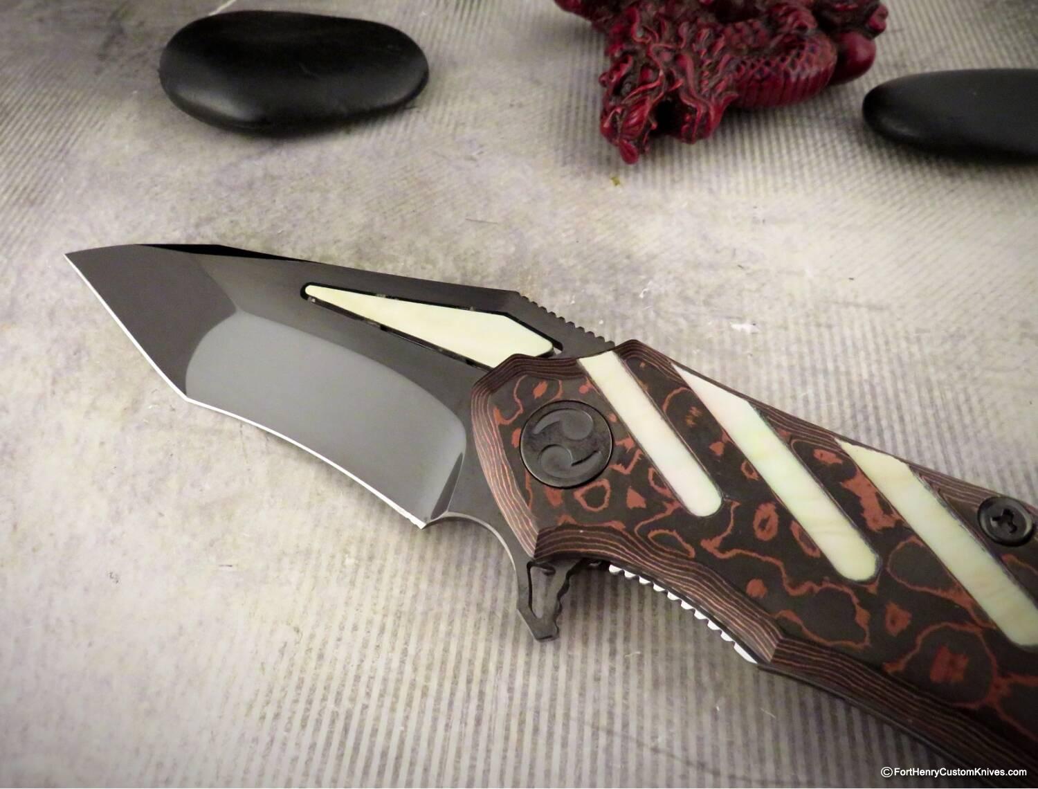 This entire knife has almost too many Special Features to showcase adequately. ~ this knife features Gorgeous Camo Copper Carbon Fiber with Gold Lip Pearl Inlays on the elegantly Contoured Frame.
